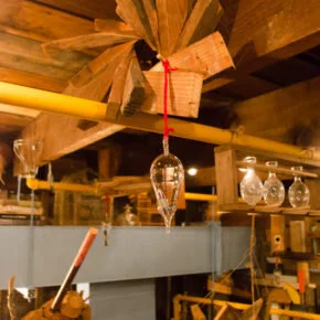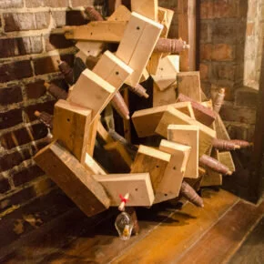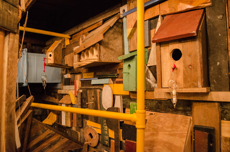The attic, transformed into aviary, becomes a beacon and a source of deliverance for those seeking to send messages to those far away. The installation, constructed of various standard and sculptural birdhouses made from the Elsewhere Wood Library, gives home to blown glass objects containing love letters sourced from Rabideau, fellow artists, interns, and staff of Elsewhere. These glass objects are placed on the landing rods of each birdhouse, awaiting the return of carrier pigeons to deliver the messages. Additionally, there is a writing station, equipped with paper, pencil, and string for binding hand-rolled notes – inviting visitors to write their own letters. At the window two lamps are timed to turn on at dusk and off at dawn. A lighted attic window, calling out into the night, is a beacon for the bearers of the messages we so deeply want to send.