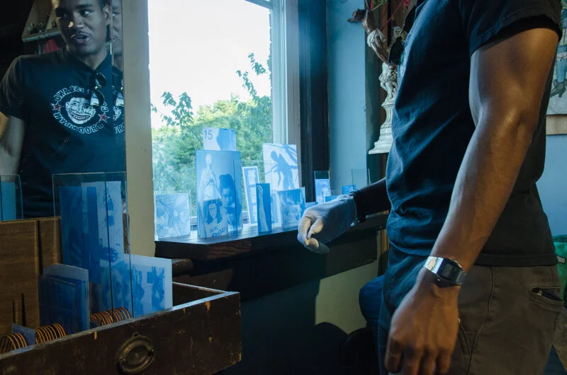 Viewers are invited to rearrange, experiment, and play with these glass while wearing white gloves. Along with the images, the installation provides seating, toys, games, and literature used directly and indirectly during Lee’s residency. Visitors and residents alike can use the space for quiet meditation or social interaction bathed in blue color created by light streaming through the glass. If one were to find themselves there in the blue light, resting amongst the creaking, dusty floors, they would find themselves in the illuminated company of Blue Monday.