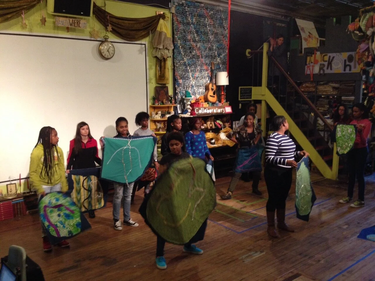 A series of interactive workshops led by Athena and dance teacher Angela Robinson explored Elsewhere’s living museum and Greensboro as sites for storytelling and experimental dance. The project culminated with an interactive performance during the Art in Odd Places public art festival in downtown Greensboro on November 1st. 2013.