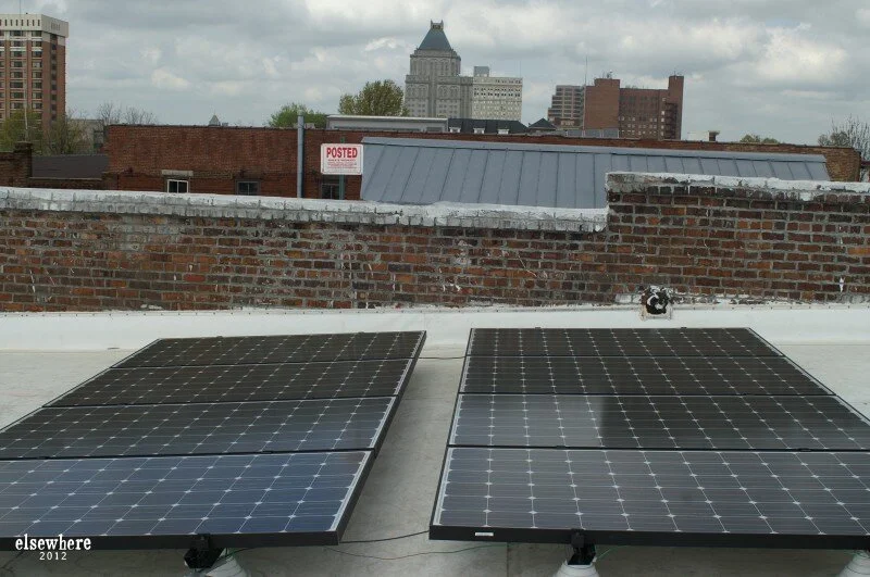 Elsewhere has solar panels. Installed in February by Greensboro-based Soleil Energy Solutions the 4.8 kW solar array on the museum’s roof offsets 30% of our electricity use. As part of a larger sustainability effort, Elsewhere invited artist Elliott P. Montgomery to connect the rooftop solar array with the street. Elliott has been installing a Town Solar Station on the museum's facade. "Distributed solar electricity in the US is often associated with the notions of ownership and the individual, but in third world villages, shared charging stations are becoming more common. How does a shared charging station work in a community like the one around Elsewhere? "The project is funded through the American Recovery and Reinvestment Act (ARRA) as part of a formula grant received by the City of Greensboro, North Carolina.