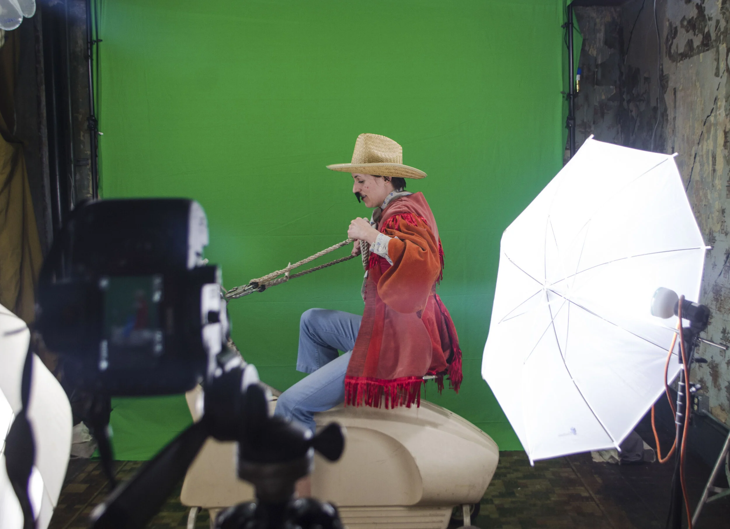Allowing items to surface from the collection, she selected materials that provided personal associations that propelled her into a state of enactment. Within the film, objects slip boundaries where they assume an enhanced, even arbitrary value, becoming magical, decorative, representational, fictive, or cognitive at any given time. For instance: a 1980’s exercise machine becomes a horse, a series of vintage plastic toys become microphones for different lounge acts, and an old family portrait a portal to whimsical landscapes.