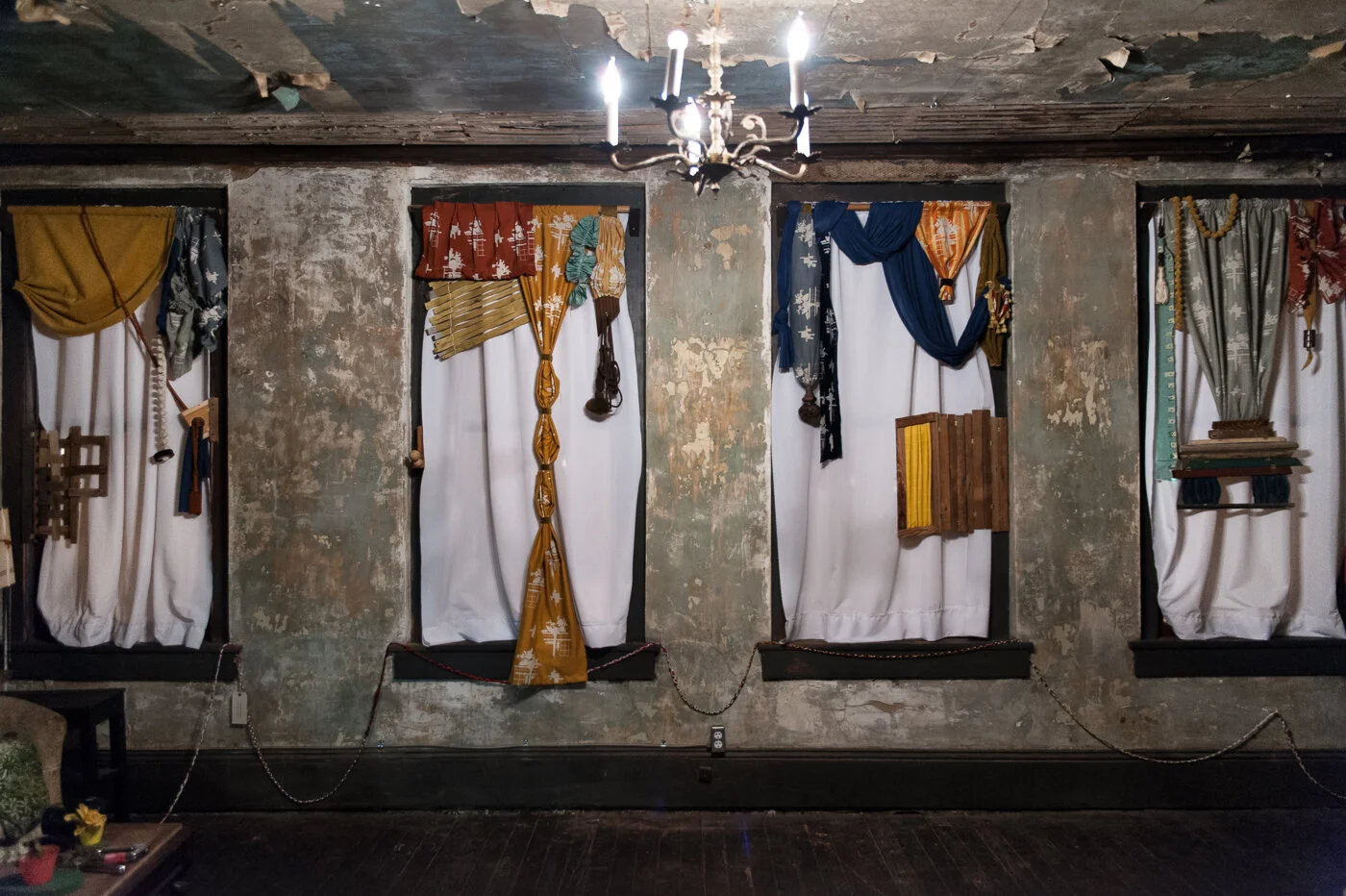 In an effort to address the fading wall paper on the third floor ghost room Devin Balara created a series of whimsical treatments based on suggestions found in 1960s and 1970s era interior design books from Elsewhere’s collection. Acting as an interior decorator, Balara coordinated the window treatments with the walls to provide a feeling of overall unity in the room and to place these elements directly in conversation with one another. The treatments are composed of fabrics that have been hand silk-screened with the window-grid and flower pattern of the wall paper and in its original colors. They drape, tuck, billow, and swoop across the windows, with subtle humor and drama. To these Balara added a sampler platter’s worth of bobble-ended holdbacks, tasseled ties, shutters, panels, shades, and blinds. The treatments are simultaneously too much and not enough. They are caught up in their own frivolity, filtering out the light that damages the wall paper, but only partially. Thus, they keep in play tensions between decorativeness and functionality, as well as restoration and revision.