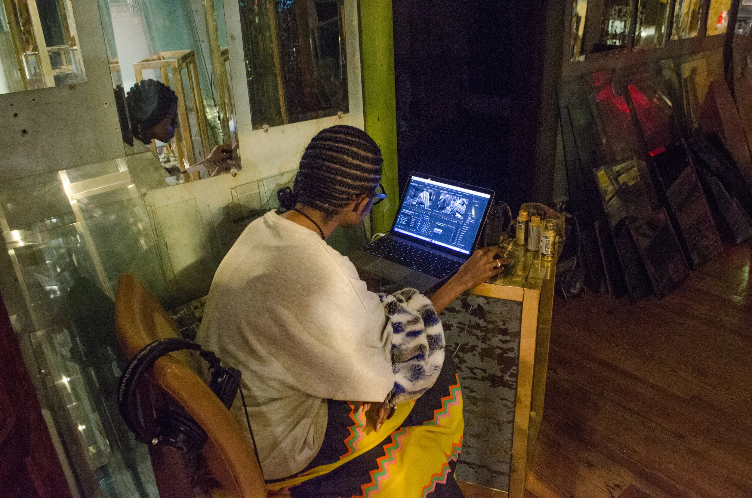 Solomon worked directly with African immigrants based in Greensboro, NC to create a documentary installation in the 2nd floor Glass Forest. The artist worked with the North Carolina African Services Coalition (NCASC) to reach out and document the stories of African women that have resettled in the area. Her video specifically captures the story of a human trafficking survivor from West Africa. Solomon also embeds gold leaf, pigment, and found hair on the walls and ceiling of the room to reference the impact of the African gold trade on today’s diaspora refugees.